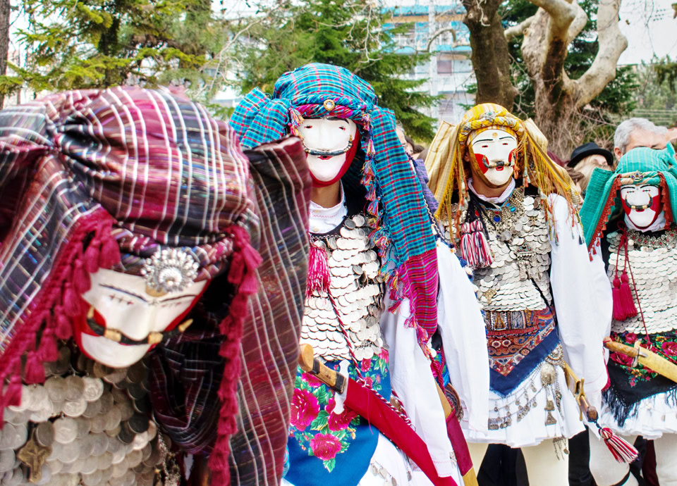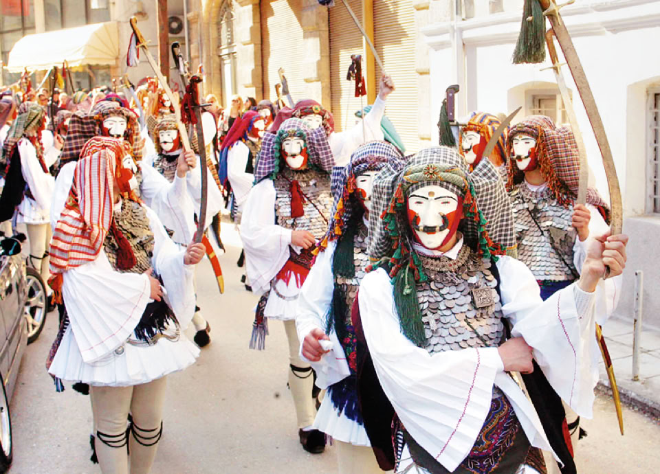 So feiert jede Region Griechenlands Apokries auf ihre eigene Weise. In Tyrnavos improvisieren beim Burani-Fest derb-humorvolle Tänzer zu treibenden traditionellen Rhythmen. In Naoussa erheben sich die Boules und Genitsari in ihren kraftvollen Tänzen gegen die Schatten der Vergangenheit und erinnern an Freiheit und Unabhängigkeit. In Thessalien und Makedonien erklingen die blechernen Glocken der Rougatsia, maskierter Tänzer, die von Dorf zu Dorf ziehen. Und in Patras, der unbestrittenen Hochburg des griechischen Karnevals, leuchten die Straßen in einem Farbenmeer aus Paraden, Musik und ausgelassenem Tanz, nicht unähnlich dem rheinischen Straßenkarneval.
