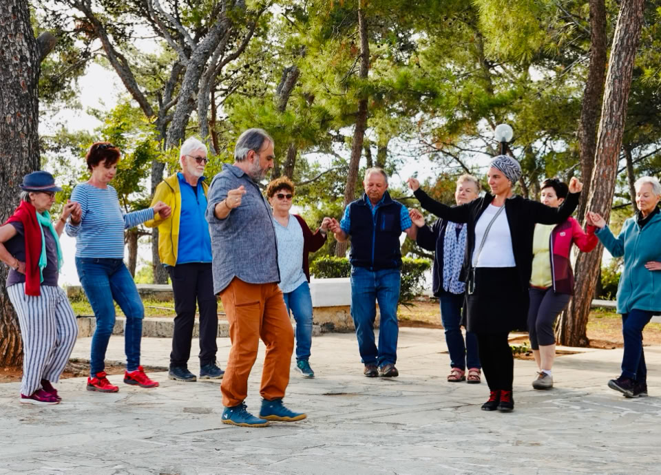 Gemeinsam tauchten wir in die spirituelle Dimension der uralten Rhythmen und Melodien ein und tanzten uns entlang der Tanzstraßen auch auf die Nachbarinseln Kretas. Gleichzeitig erfuhren wir mehr über den mythologischen, historischen und kulturellen Hintergrund der traditionellen griechischen Lieder und Tänze.