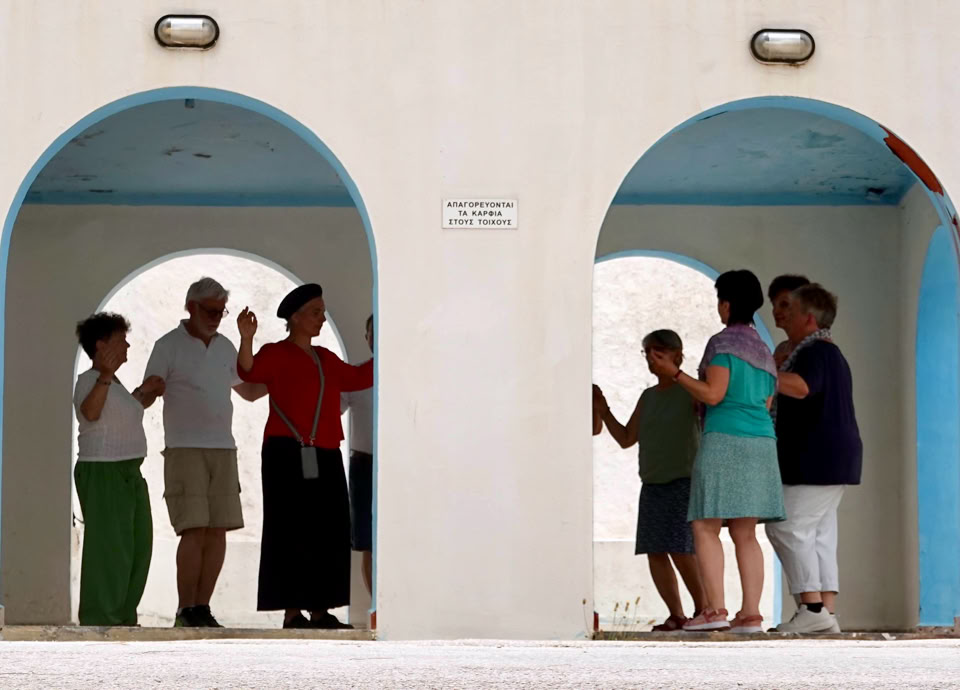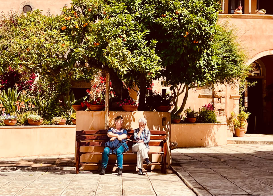 Die Vormittage begannen ganz frei – jede und jeder nach dem eigenen Rhythmus. In unseren Zimmern fanden wir alles für ein schlichtes Frühstück: Tee, Kaffee, Zwieback, Marmelade, Honig, Wasser und Saft. Wer mochte, holte sich frisches Obst, Joghurt oder Gebäck aus dem Supermarkt nebenan oder von einer der beiden nahegelegenen Bäckereien. Und dann wählten wir unseren Platz: vielleicht den Balkon, wo die ersten Sonnenstrahlen den Tag streichelten, oder den stillen Garten, in dem sich Vogelgezwitscher und Blütenduft miteinander vermischten. Manche zog es in die kleinen Tavernen am Hafen – wo das Frühstück nach Meer, Sonne und kretischer Lebensart schmeckte.
