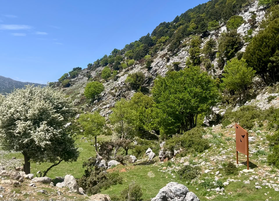 Weiter führte uns der Weg nach Agios Ioannis, dem letzten mit dem Auto erreichbaren Bergdorf in den Weißen Bergen. Auf 775 m Höhe scheint hier die Zeit stillzustehen. Von dort aus wanderten wir auf einem alten, von Lesesteinmauern gesäumten Pfad durch einen lichten Wald aus Kretischen Zypressen und Kalabrischen Kiefern – begleitet vom würzigen Duft des Waldes und dem leisen Knistern der Stille.