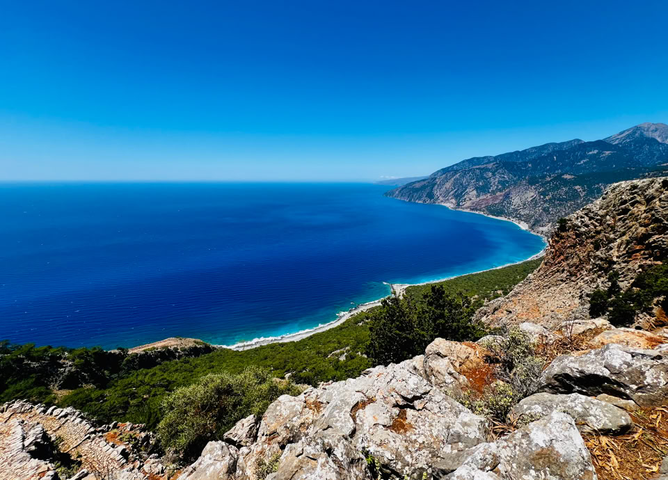 Schließlich erreichten wir das Kliff von Selouda auf 540 m Höhe. Der Ausblick dort ist überwältigend: Tief unter uns liegt das Libysche Meer, seine Blautöne changieren je nach Sonnenstand, und in der Ferne erblicken wir Agia Roumeli – winzig klein, aber klar zu erkennen.