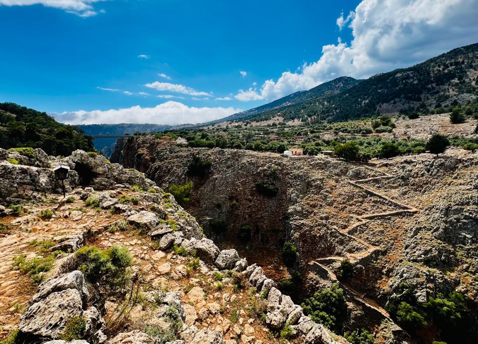 Über die spektakuläre Vardinogiannis-Brücke erreichten wir das verlassene Dorf Aradena, das wie ein offenes Geschichtsbuch wirkt. Seine halb zerfallenen Natursteinhäuser erzählen von einem einstigen Leben in rauer, abgelegener Umgebung. Eine alte Kreuzkuppelkirche wacht noch immer über den Ort, und zwischen den Ruinen erahnt man die einstige Dorfgemeinschaft, deren Spuren langsam von der Natur zurückerobert – und teilweise liebevoll restauriert – werden.
