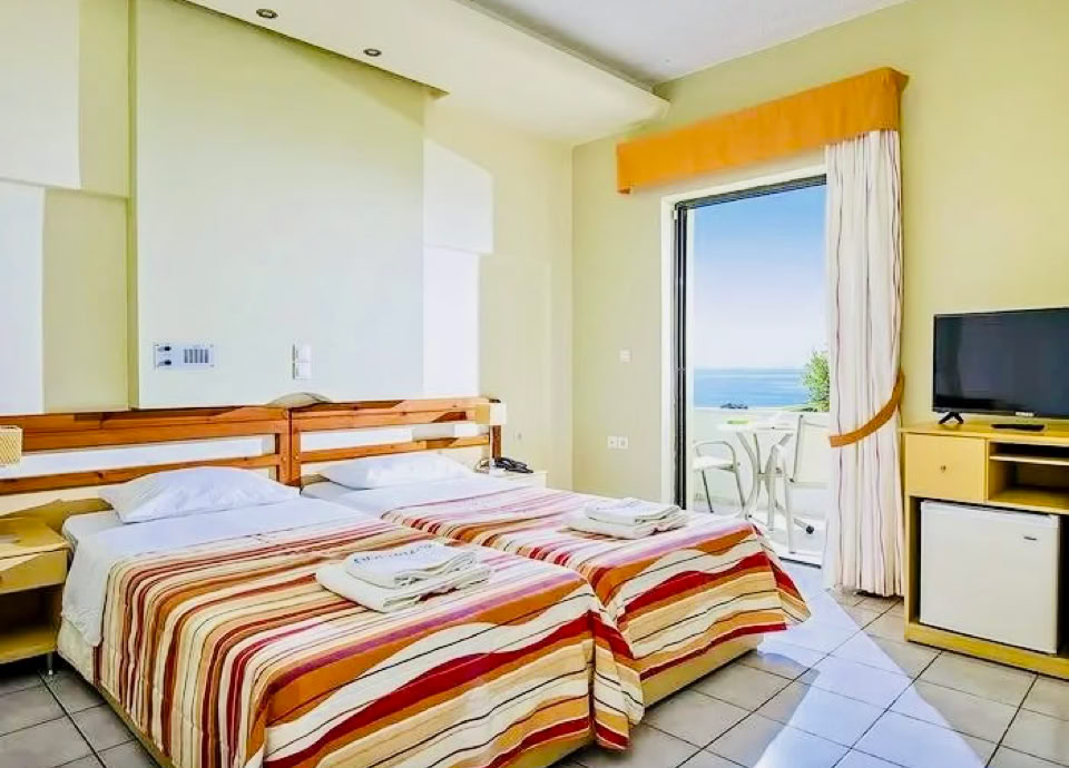 Wir wohnen im familiengeführten Polyrizos Hotel. Das charmante Refugium liegt terrassenförmig in traumhafter und ruhiger Lage oberhalb der Polyrizos-Bucht mit Blick auf das Libysche Meer.
