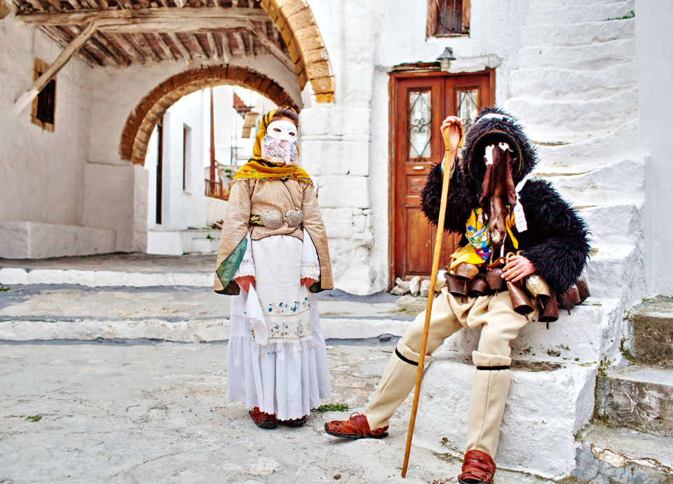 Schon der Name „Apokries“ – „Abkehr vom Fleisch“ – verweist auf die kommende Fastenzeit. Doch jenseits der christlichen Symbolik schwingen tiefere, ältere, ihrem Wesen nach vorchristliche Aspekte mit. In den dionysischen Festen der Antike liegen die Wurzeln jener Tradition, die sich über Jahrtausende erhalten hat: Trance, Tanz und Trubel als Tore in eine andere Welt. Die Dionysien feierten den Gott des Rausches und der Ekstase, wie auch die Anthesteria, die antiken dionysischen Fruchtbarkeitsrituale der Athener. Sie trieben mit Tanz, Spiel und Satire den Winter aus und läuteten mit närrischem Übermut den Frühling ein. Die Elemente dieser antiken Rezeptur blieben über Jahrhunderte – durch byzantinische Zeiten und osmanische Herrschaft hindurch – erhalten. Die Bräuche, die im Laufe der Jahrhunderte im weiten Spektrum zwischen Kult und Kultur antike, historische und soziokulturelle Qualitäten vereinen, sind und bleiben vielerorts lebendig.