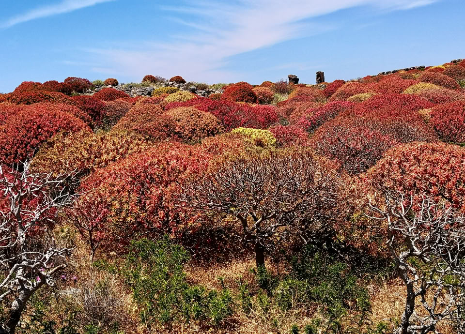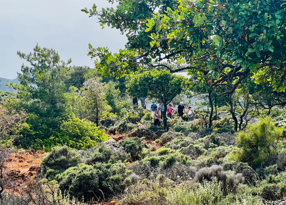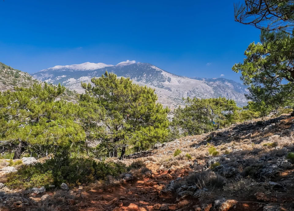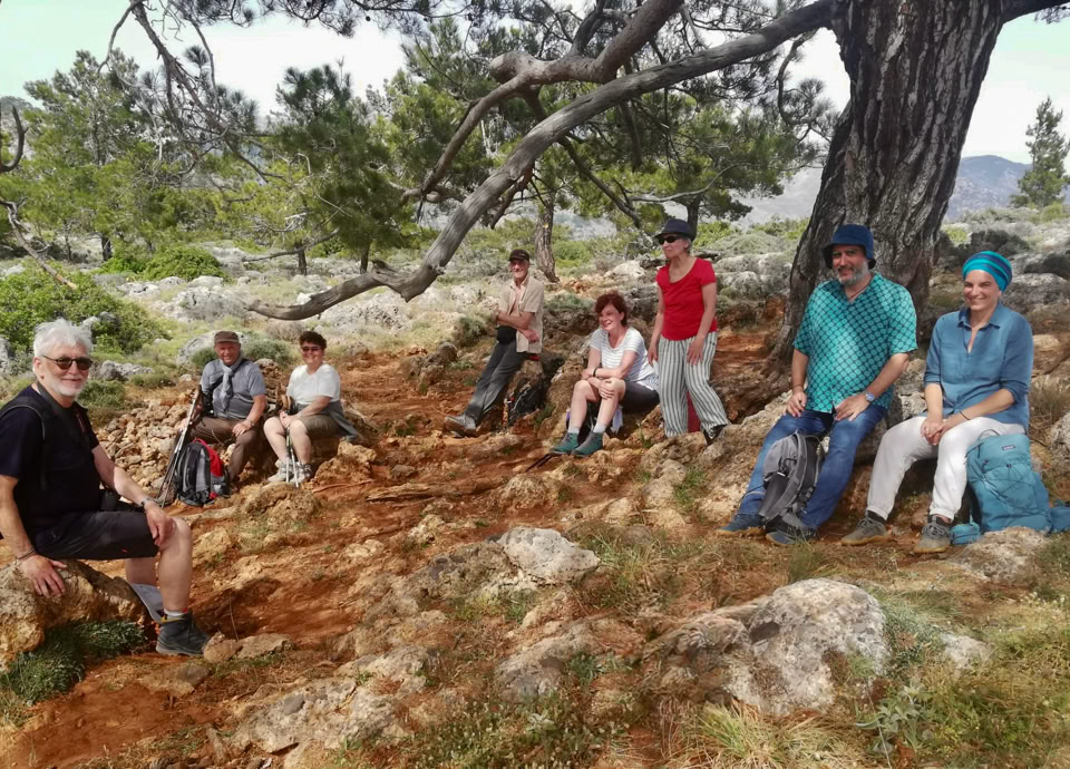 Weiter führte uns der Weg nach Agios Ioannis, dem letzten mit dem Auto erreichbaren Bergdorf in den Weißen Bergen. Auf 775 m Höhe scheint hier die Zeit stillzustehen. Von dort aus wanderten wir auf einem alten, von Lesesteinmauern gesäumten Pfad durch einen lichten Wald aus Kretischen Zypressen und Kalabrischen Kiefern – begleitet vom würzigen Duft des Waldes und dem leisen Knistern der Stille.