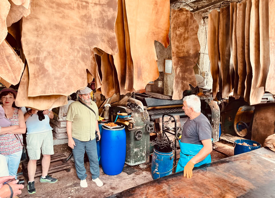 Neben den vielen historischen Gebäuden stießen wir auf unserem Rundgang auch auf die „Tabakaria“ – die letzten noch erhaltenen Gerbereien der Stadt. Christos, einer der wenigen verbliebenen Gerber, unterbrach seine Arbeit und ließ uns eintauchen in die Welt dieses alten Handwerks. Mit dem beißenden Geruch noch in der Nase erreichten wir schließlich die kleine Kirche Agia Kyriaki, wo wir ein Tänzchen wagten – und das große Glück hatten, Eftychis und Nektarios Kostakis zu begegnen. Zwei herausragende Musiker, die uns mit ein paar eindrucksvollen Beispielen in die städtische Musikkultur Westkretas einführten: die Tabachaniotika – eine Klangwelt, die kretische städtische Musik mit Einflüssen Kleinasiens verbindet, geprägt von den Flüchtlingen der 1920er Jahre. So entstand eine Form des kretischen Rembetiko, authentisch gespielt von Nektarios auf dem Boulgari und unbeeindruckt von Südwind, Schwüle und Saharastaub gesungen von Eftychis – in seinem ganz eigenen, charakteristischen Stil.