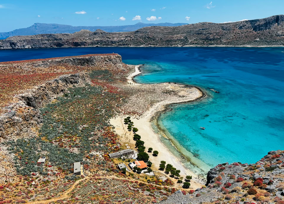 Unser erster Halt im äußersten Nordwesten der Insel: der Strand von Balos, eine Lagune von herausragender natürlicher Schönheit an der äußersten Spitze der Halbinsel Gramvousa, dem westlichsten Punkt Kretas. Das gesamte Gebiet wurde im Rahmen des Natura-2000-Programms zum Naturschutzgebiet erklärt, und seine Erhaltung hat für uns oberste Priorität.