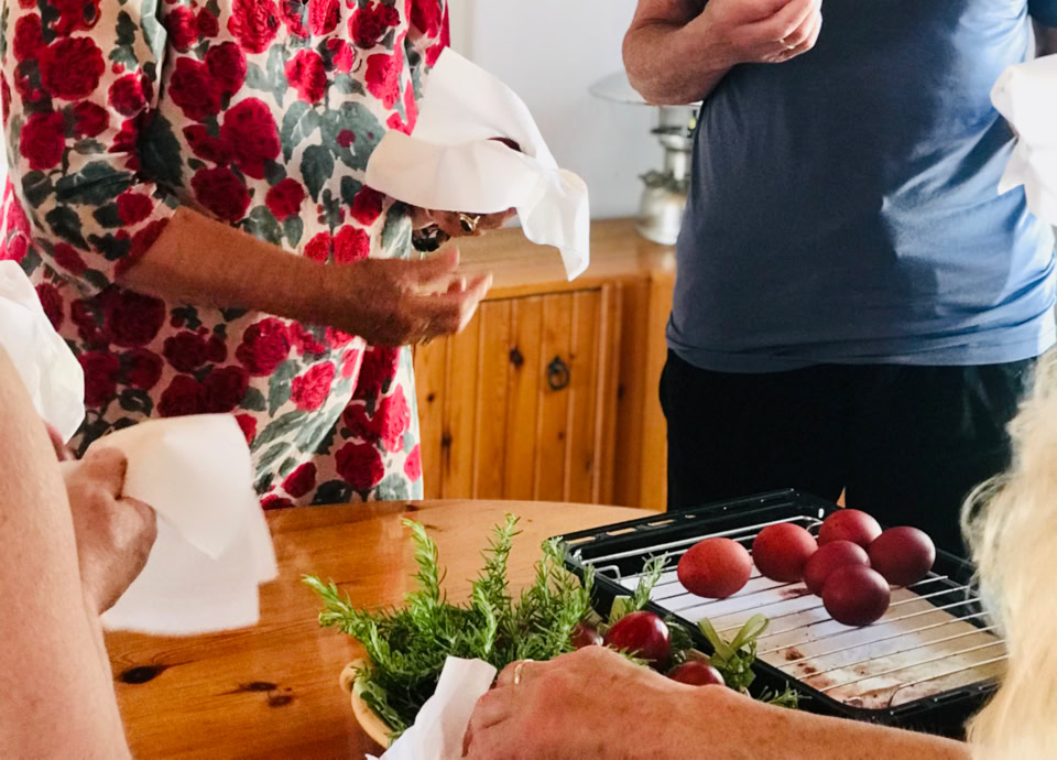 Das größte Fest des Jahres erfordert in den kretischen Dörfern umfangreiche Planungen, so auch in Chora Sfakion. Folglich hatten auch wir außerhalb der kirchlichen Vorbereitungen alle Hände voll zu tun, färbten etwa Eier mit Färberkrapp tiefrot und polierten sie anschließend mit ein wenig kostbarem Olivenöl festlich glänzend.